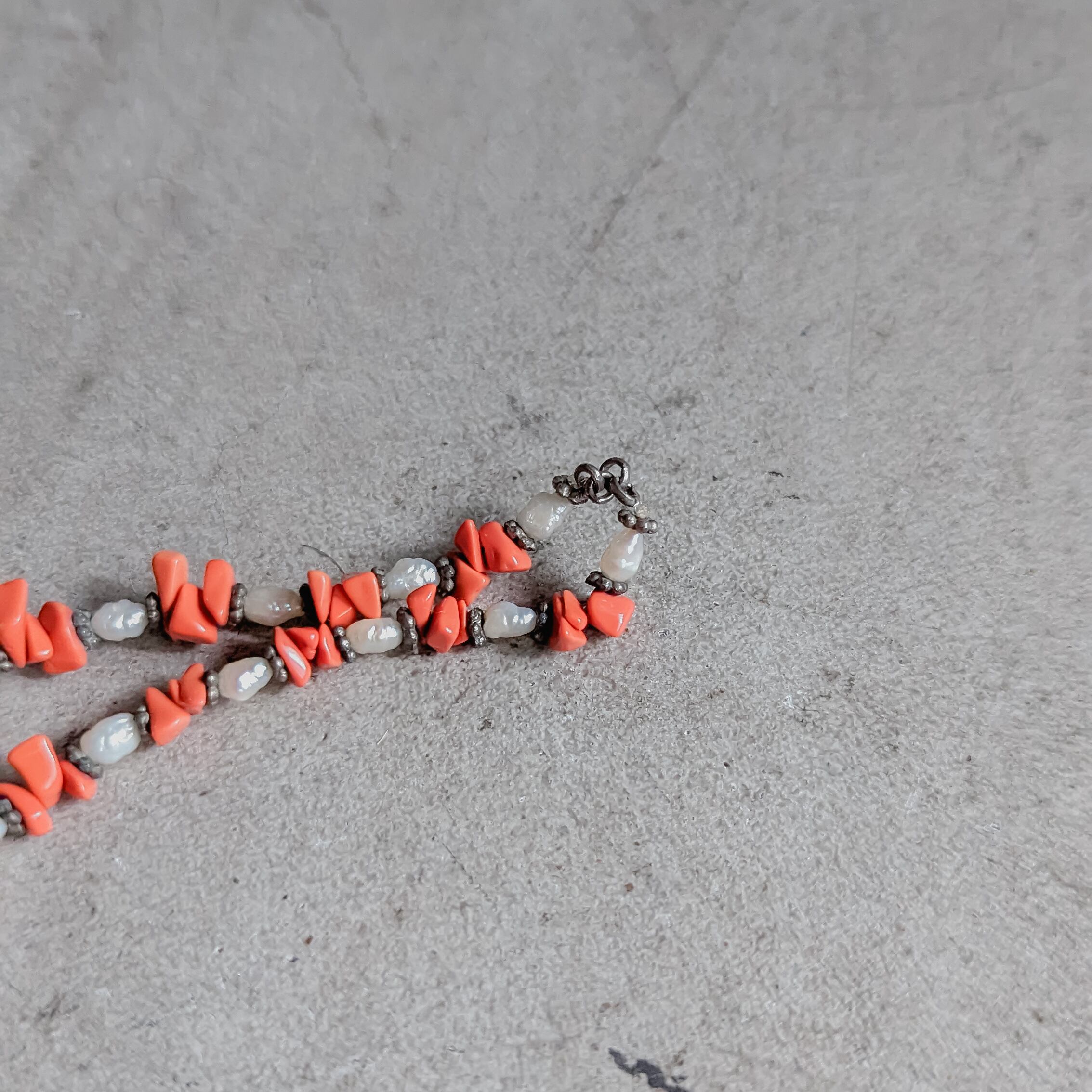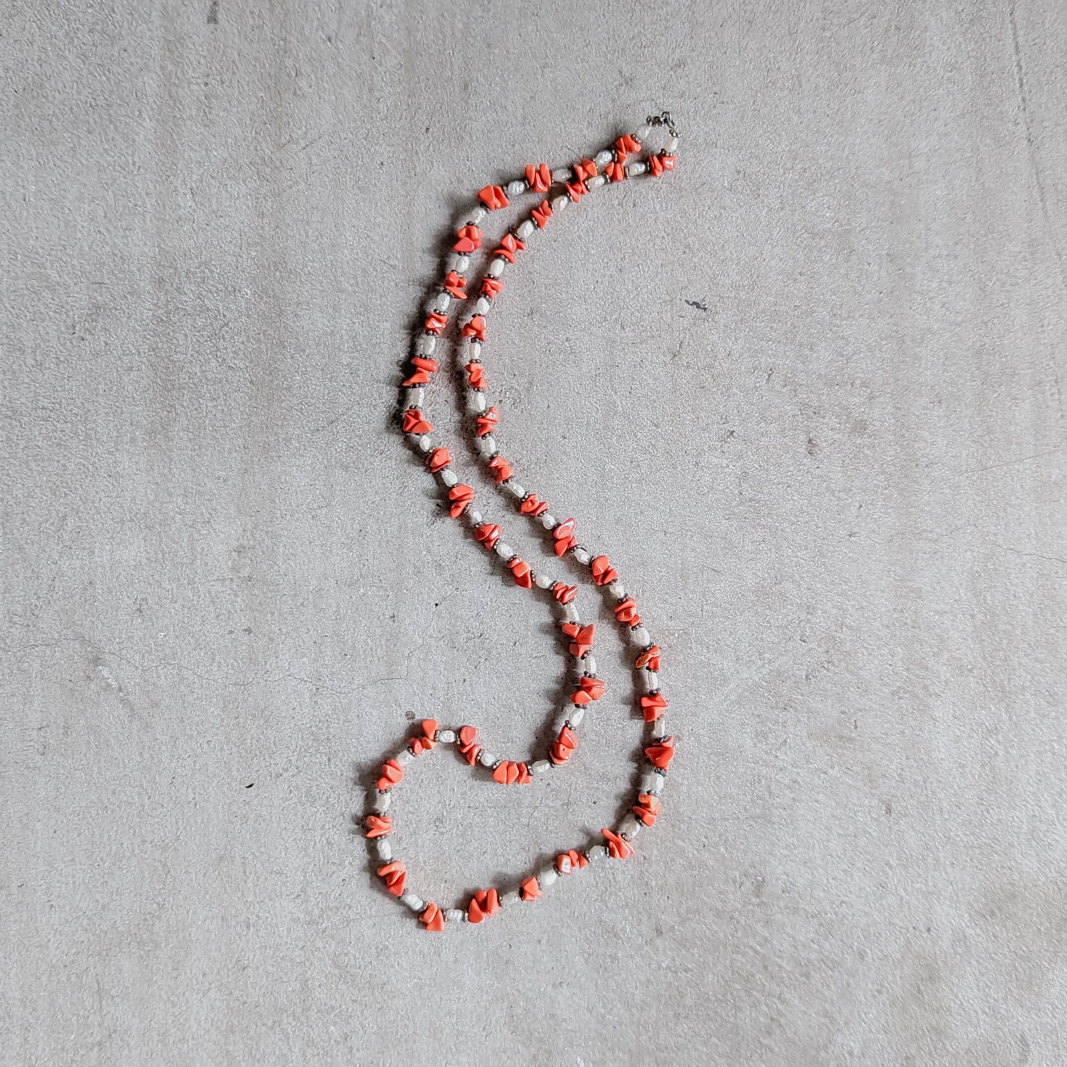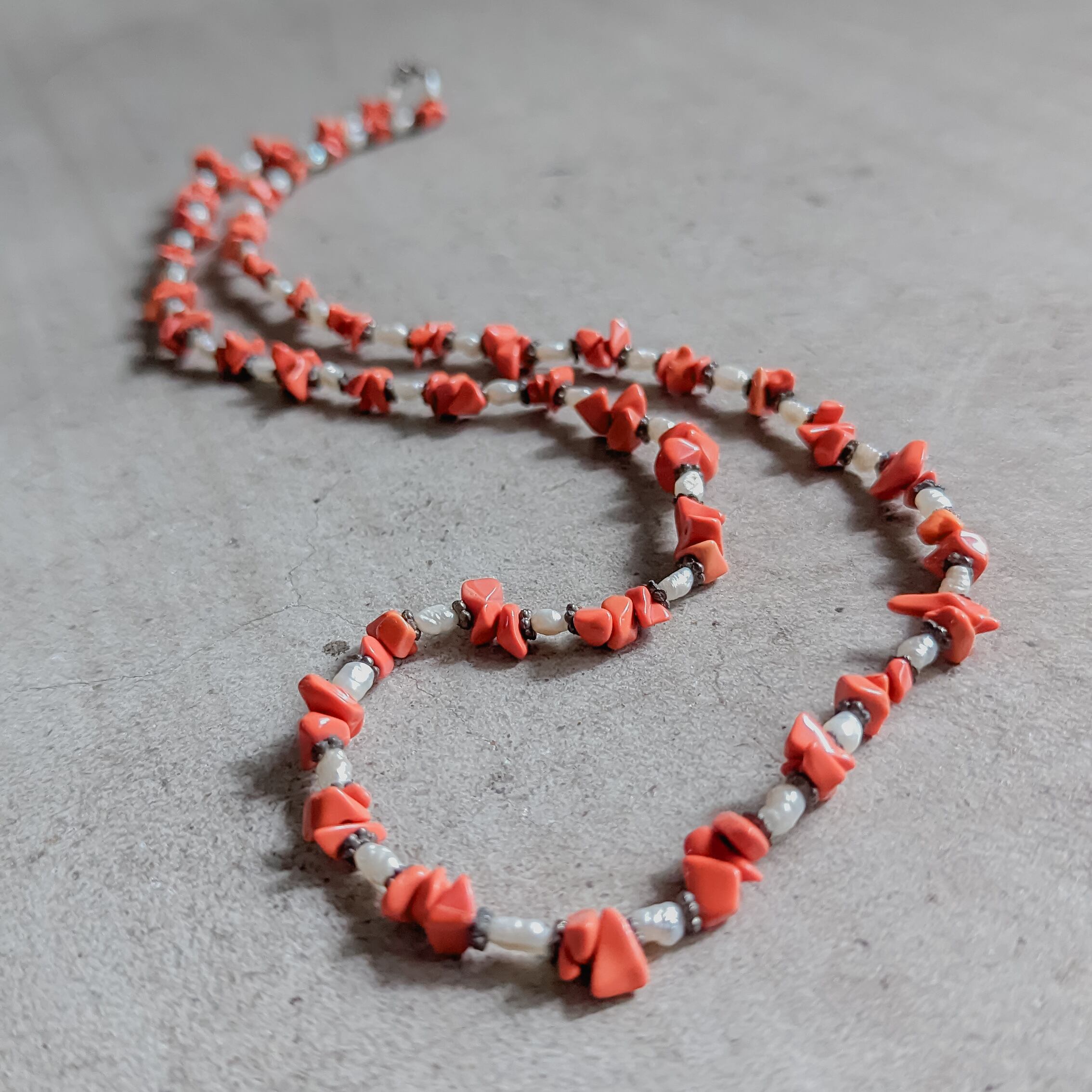 不揃いの珊瑚とパールがかわいらしいネックレス。季節感じるゆとりある長さで、夏では主役級の1品