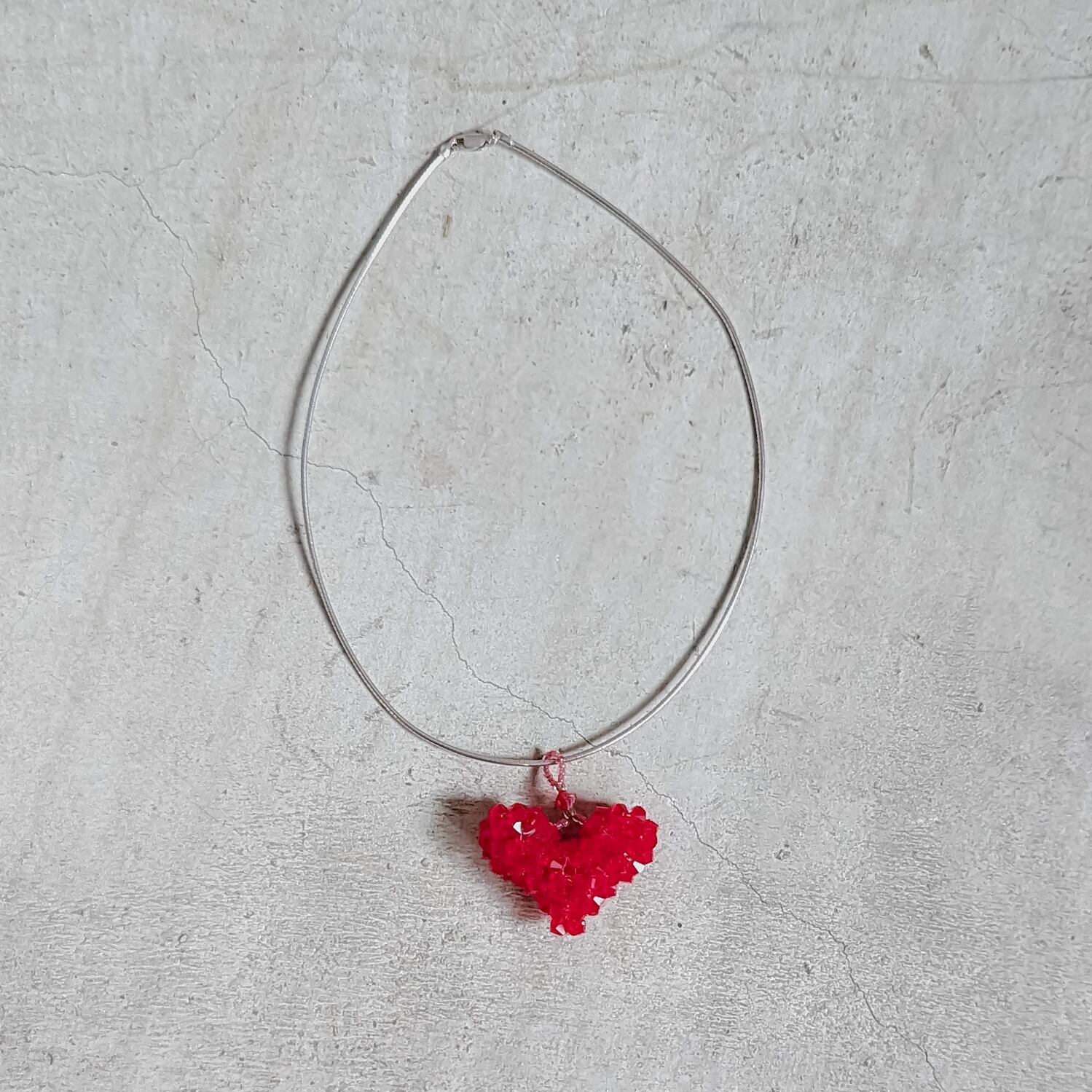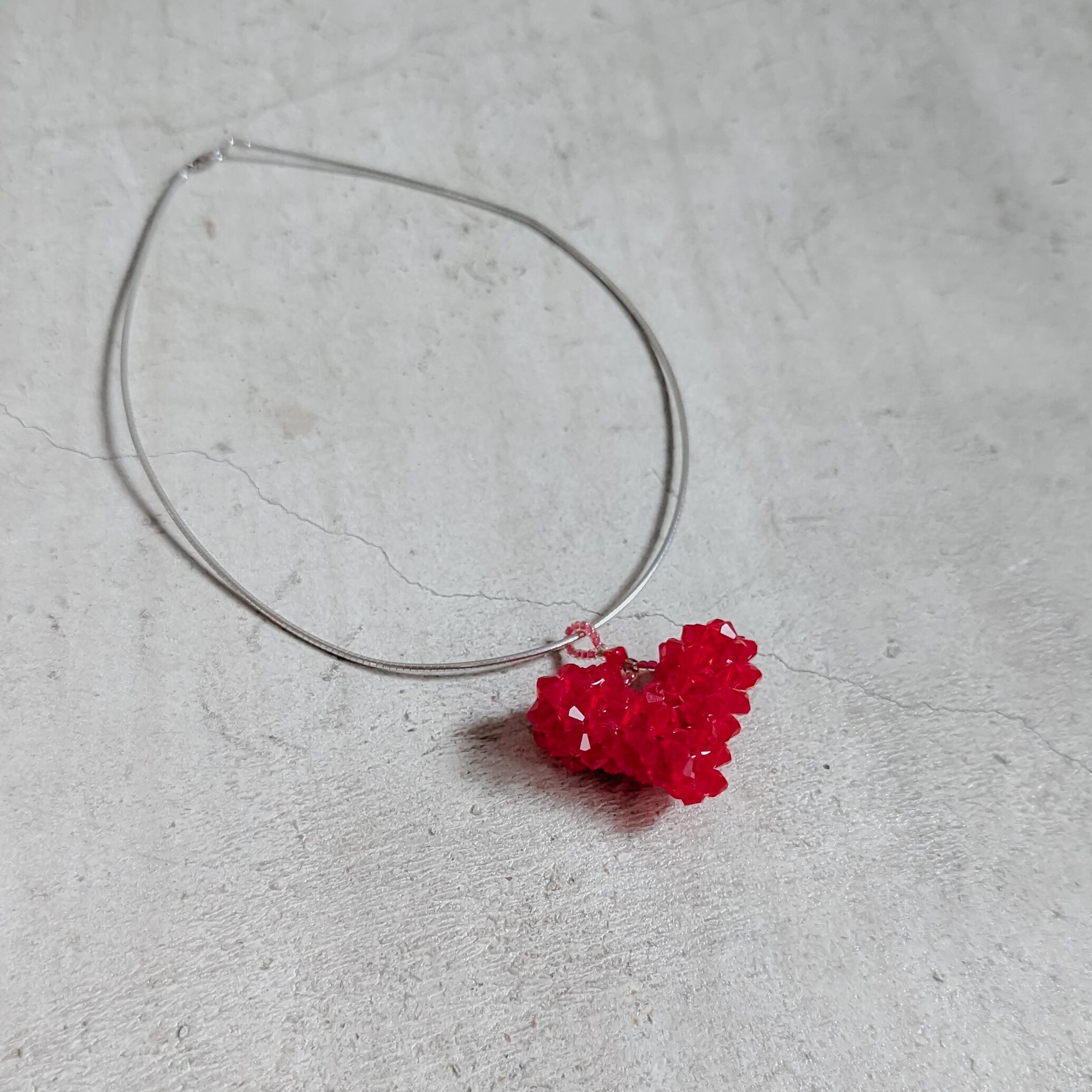 真っ赤なビーズで作られたハートがキュートなネックレス。エレガントな着こなしに合わせたい。