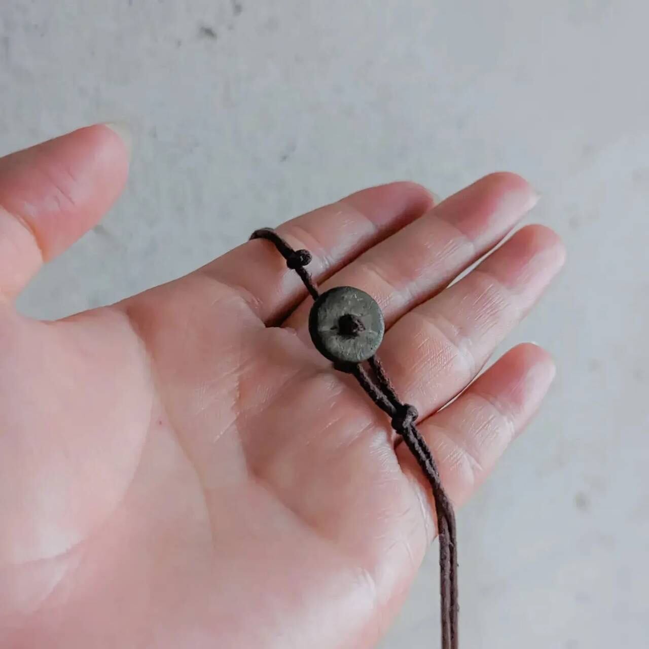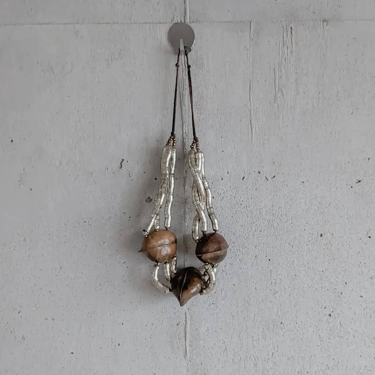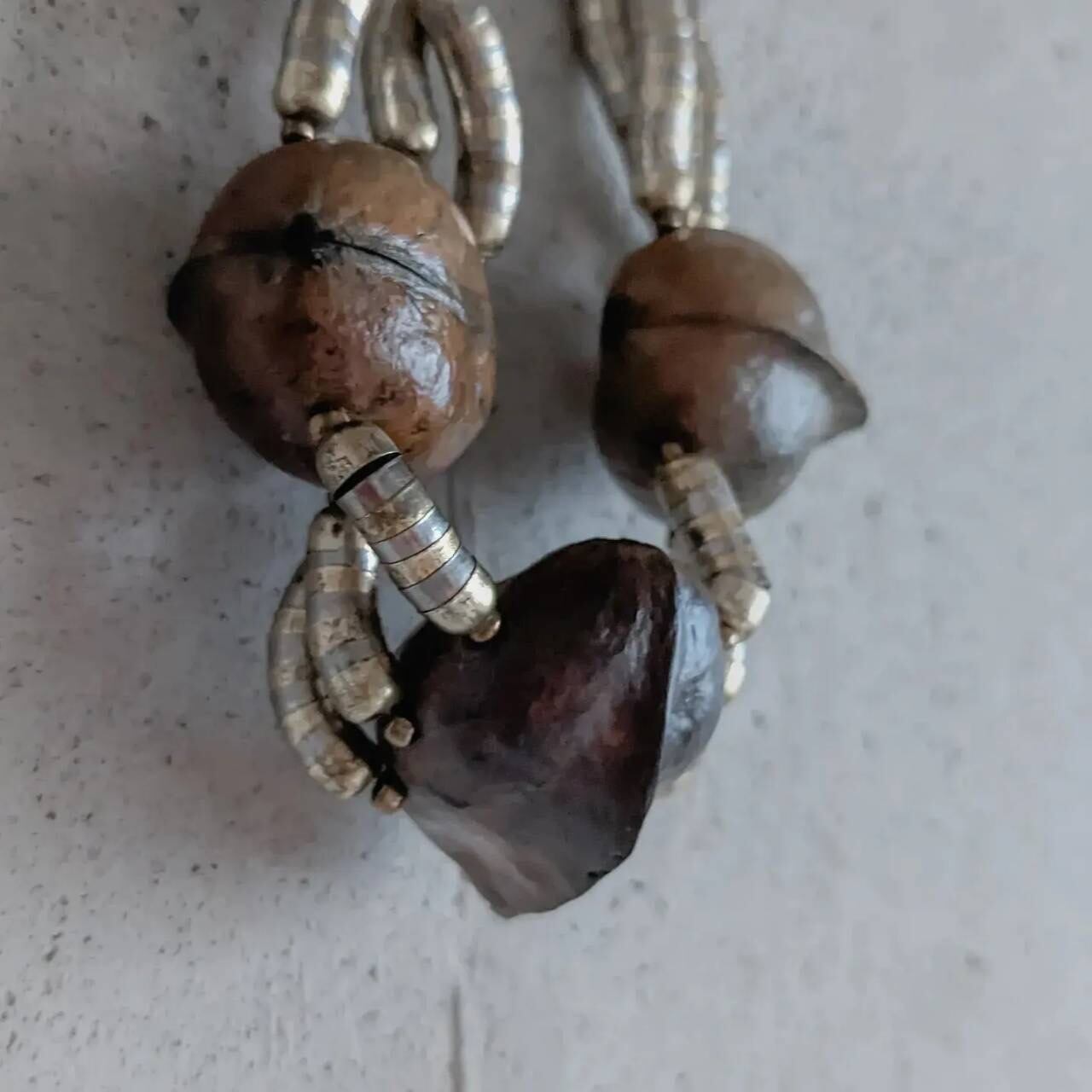 巨大な木の実が3つ連なったネックレス。あまりにも強烈な印象を残す超主役級のこのネックレスは、来る秋冬シーズンに重宝する。