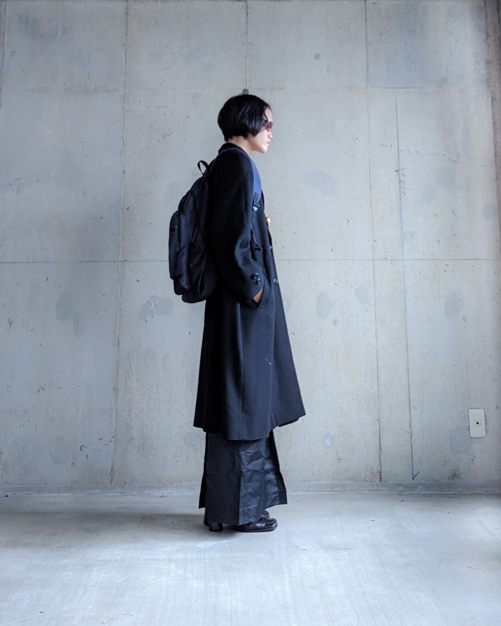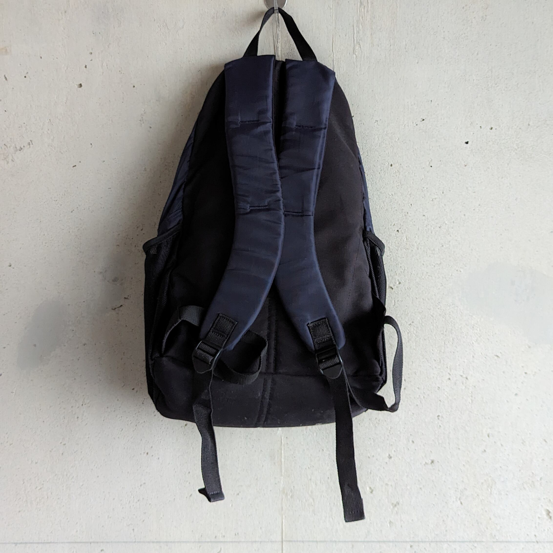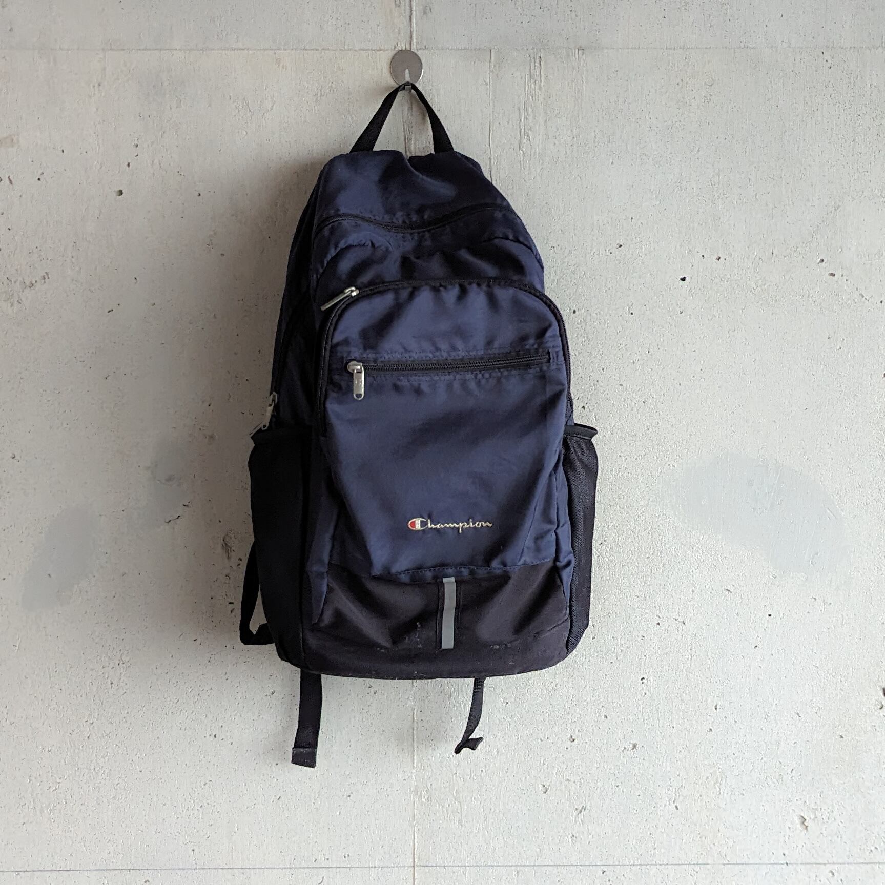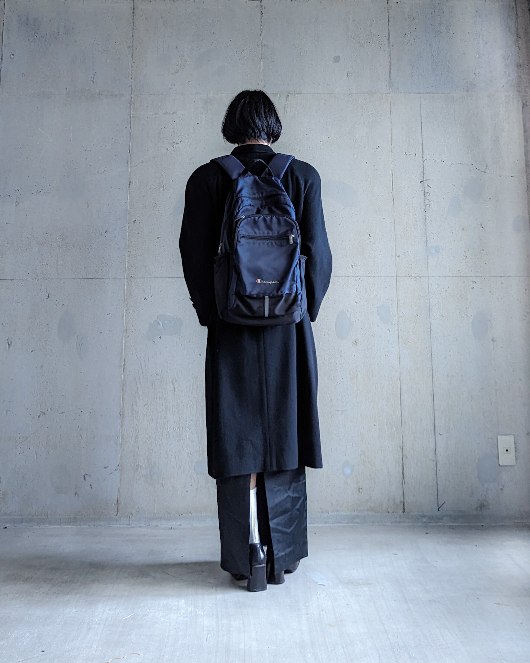 テックなチャンピオンのバックパック。ネイビー×ブラックの色味が素晴らしく、オールブラックに刺さる。