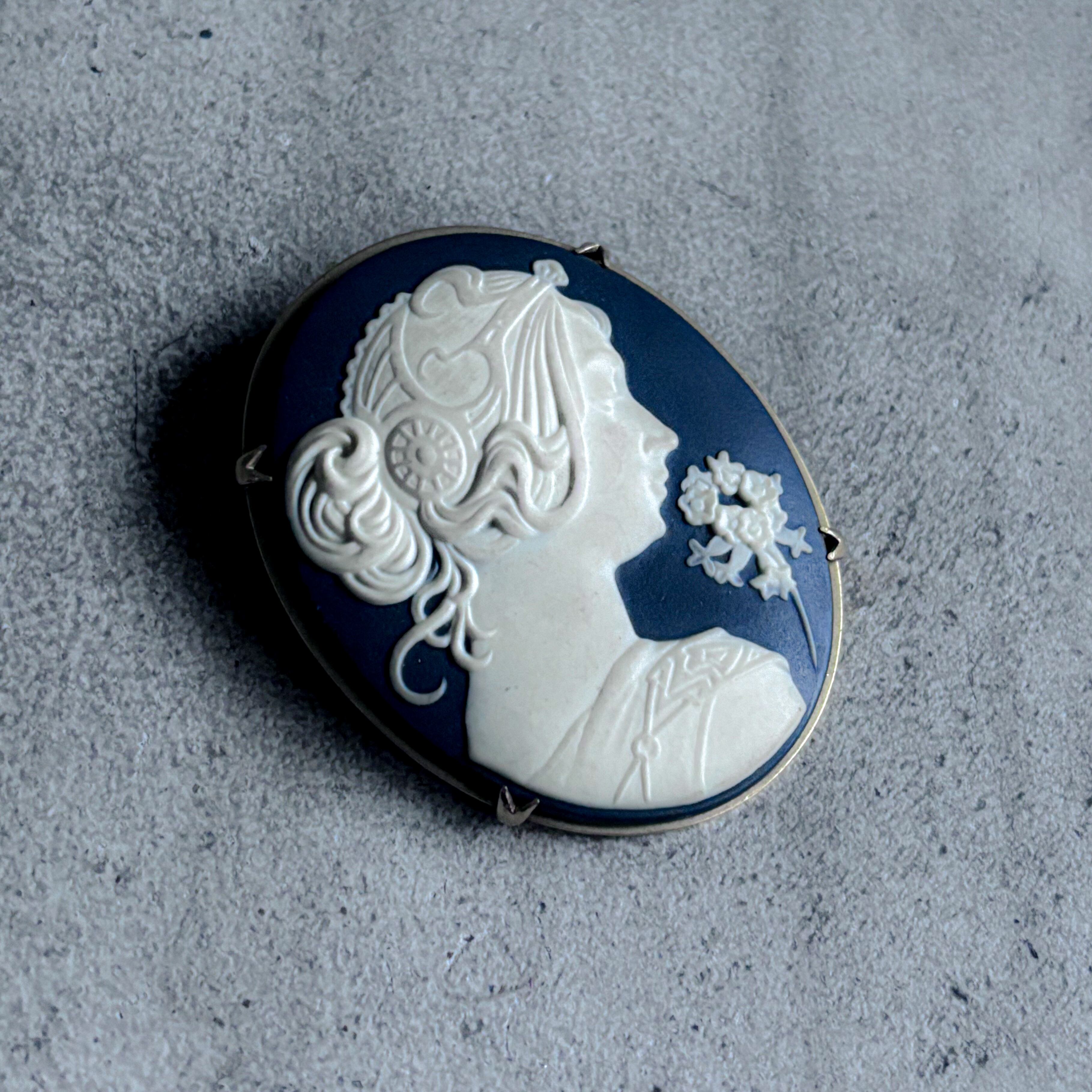 控えめな青ベースのカメオブローチ。ペンダントトップとして首から下げるのも良い。